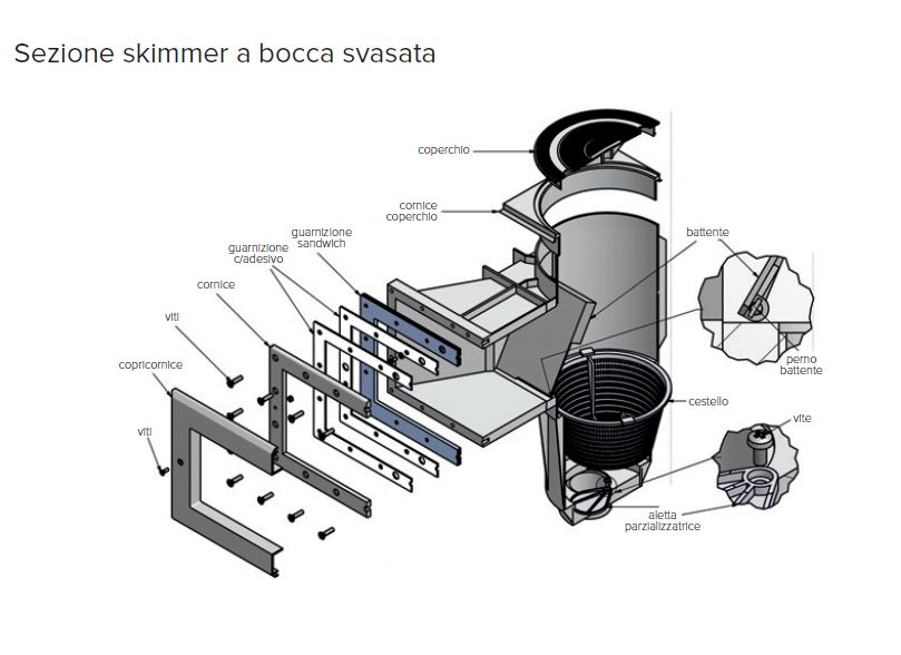 In abs grigio grafite per skimmer Pool’s. E’ una cornice copriflangia per la rifinitura estetica degli skimmer a bocca svasata, applicabile anche agli skimmer esistenti con sistema di fissaggio di sicurezza (non a scatto), per evitare la manomissione da parte degli utenti. Da abbinare a rivestimenti di colore grigio scuro.