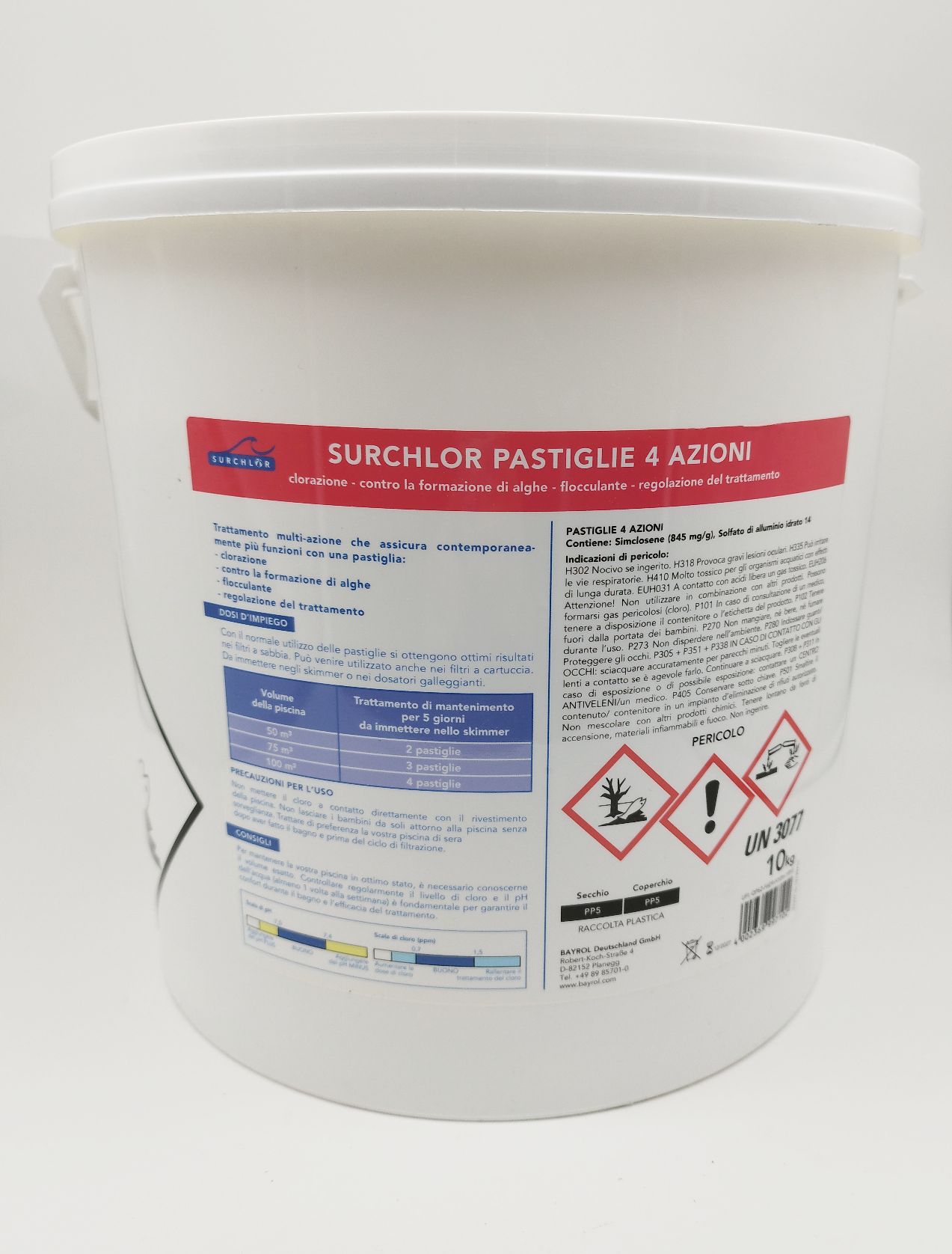 Pastiglie di cloro a 4 azioni a base di cloro, antialghe, flocculante ed equilibratore. 75% di cloro attivo. Utilizzato per la clorazione lenta e costante dell’acqua della piscina. Indicato per dosatori a lambimento, galleggianti o da inserire direttamente nello skimmer.